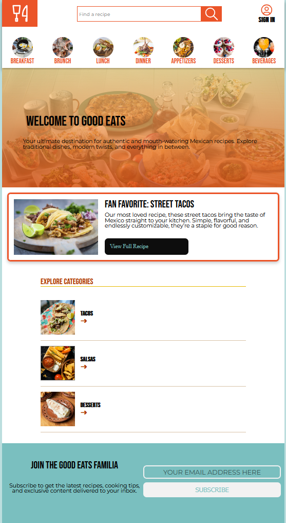 Good eats was looking to have their website design translated into a living prototype. They provided mock-ups for three different breakpoints.